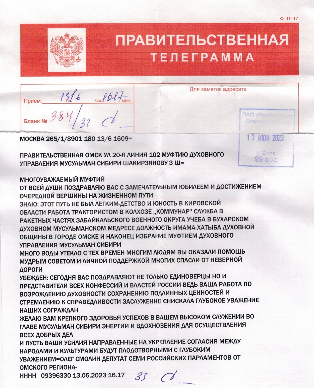 Правительственная телеграмма Поздравления Муфтия ДУМ Сибири от Депутата Гос. Думы РФ Смолина